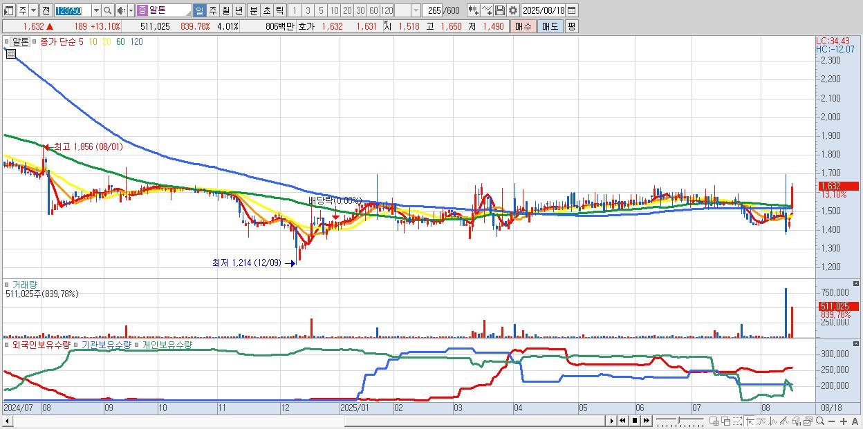 - 알톤 (1,632원 ▲ 13.1% , 시총: 208억, 거래량: 511,025, 거래대금:8억)