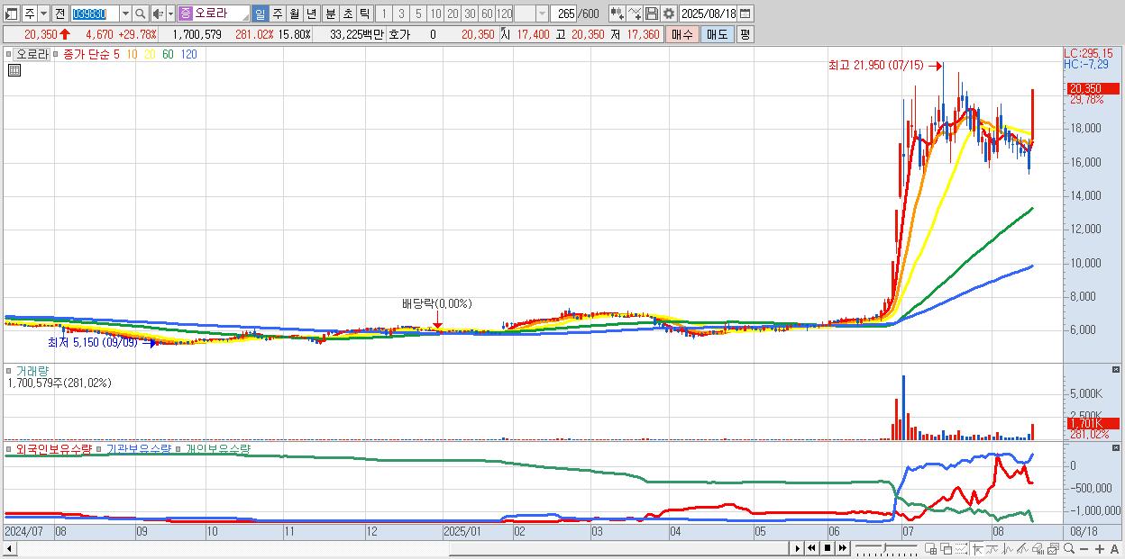 - 오로라 (20,350원 ▲ 29.78% , 시총: 2,190억, 거래량: 1,700,579, 거래대금:332억)