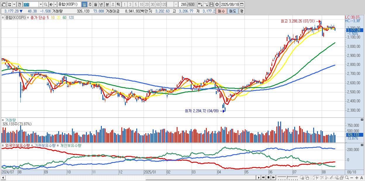 | 08/14 | 3,225.66 | ▲0.04% | -534억 | -779억 | 197억 | 1,116억 |