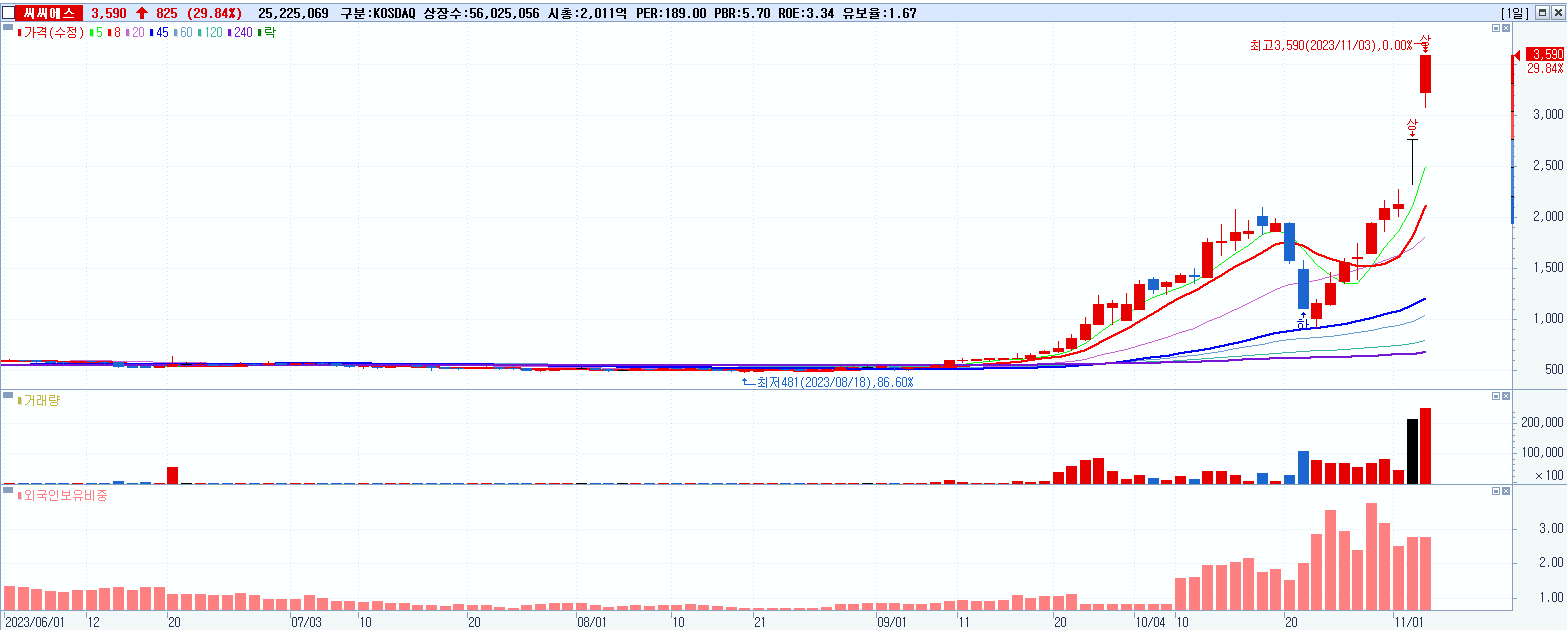 - 씨씨에스 (3,590원 ▲ 29.84% , 시총: 2,011억, 거래량: 25,225,069, 거래대금:859억)