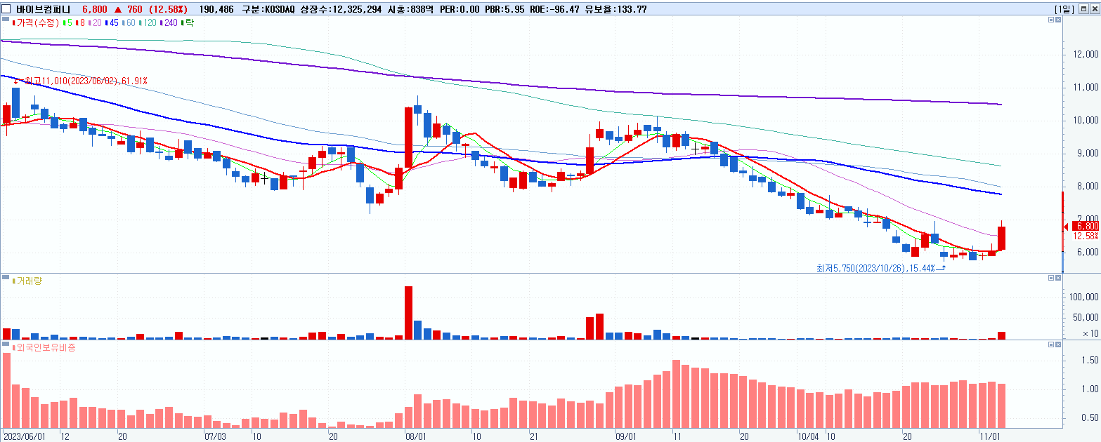 - 바이브컴퍼니 (6,800원 ▲ 12.58% , 시총: 838억, 거래량: 190,486, 거래대금:13억)