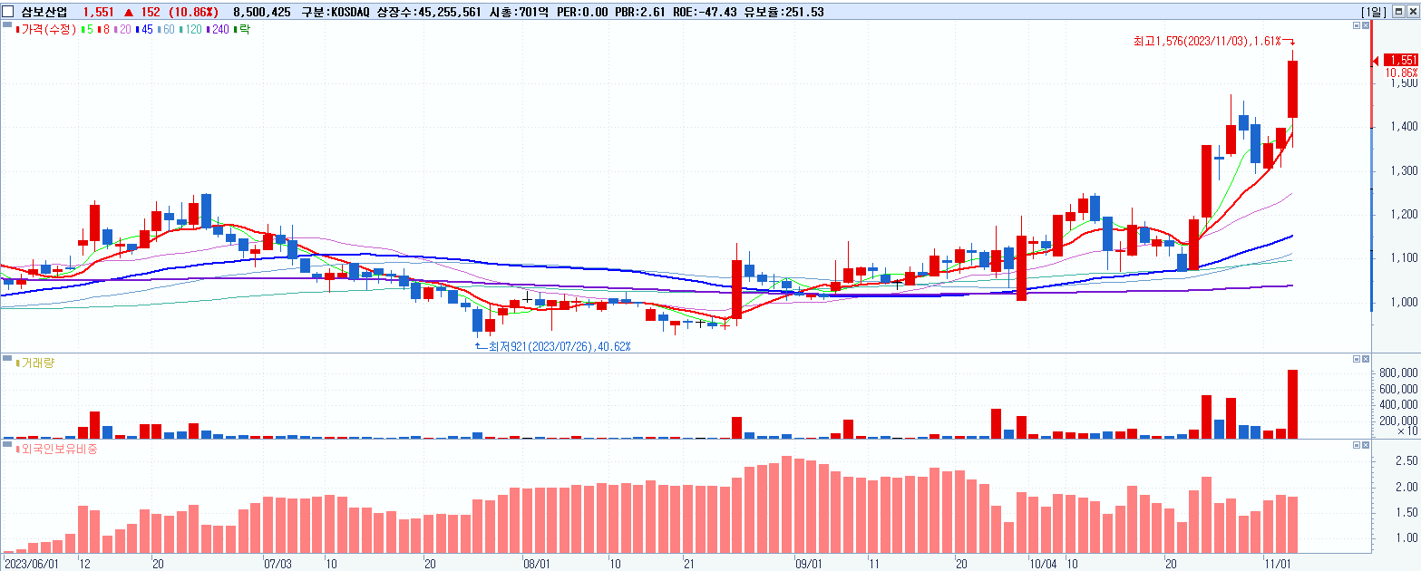 - 삼보산업 (1,551원 ▲ 10.86% , 시총: 702억, 거래량: 8,500,425, 거래대금:128억)