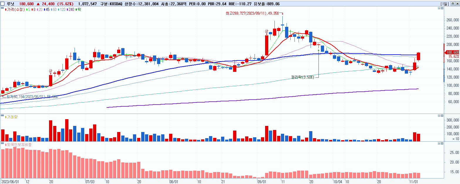 - 루닛 (180,600원 ▲ 15.62% , 시총: 22,360억, 거래량: 1,072,547, 거래대금:1,828억)