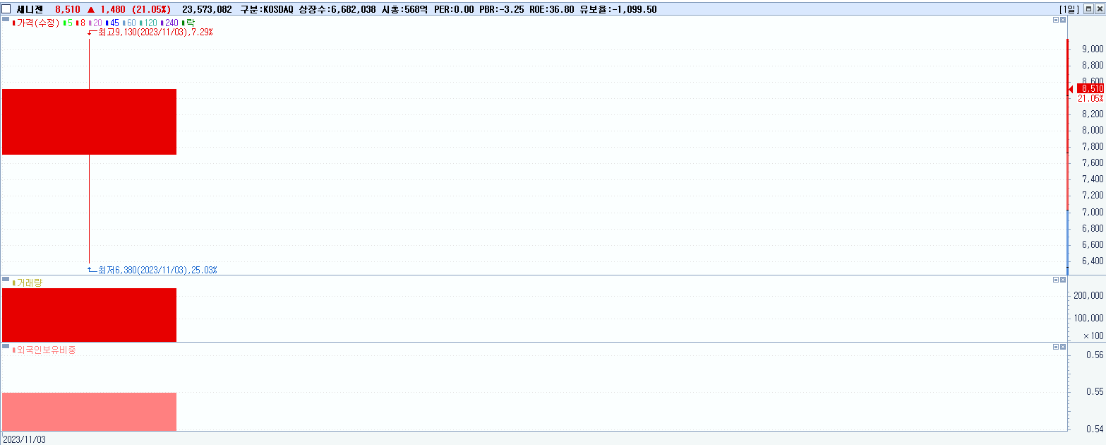 - 세니젠 (8,510원 ▲ 21.05% , 시총: 569억, 거래량: 23,573,082, 거래대금:1,949억)