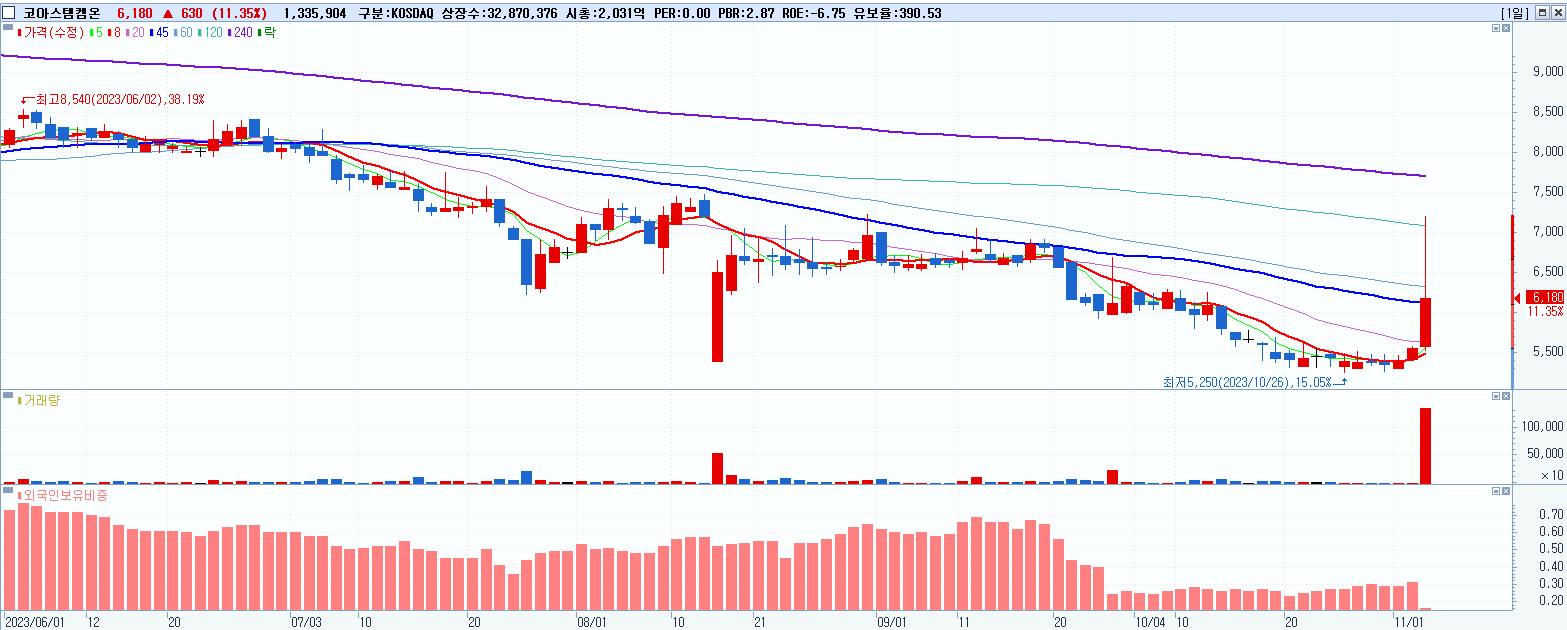 - 코아스템켐온 (6,180원 ▲ 11.35% , 시총: 2,031억, 거래량: 1,335,904, 거래대금:88억)