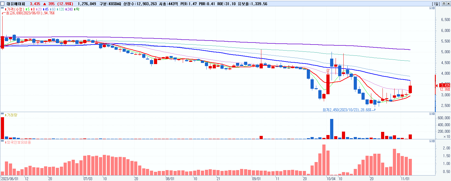 - 대유에이피 (3,435원 ▲ 12.99% , 시총: 443억, 거래량: 1,276,049, 거래대금:43억)