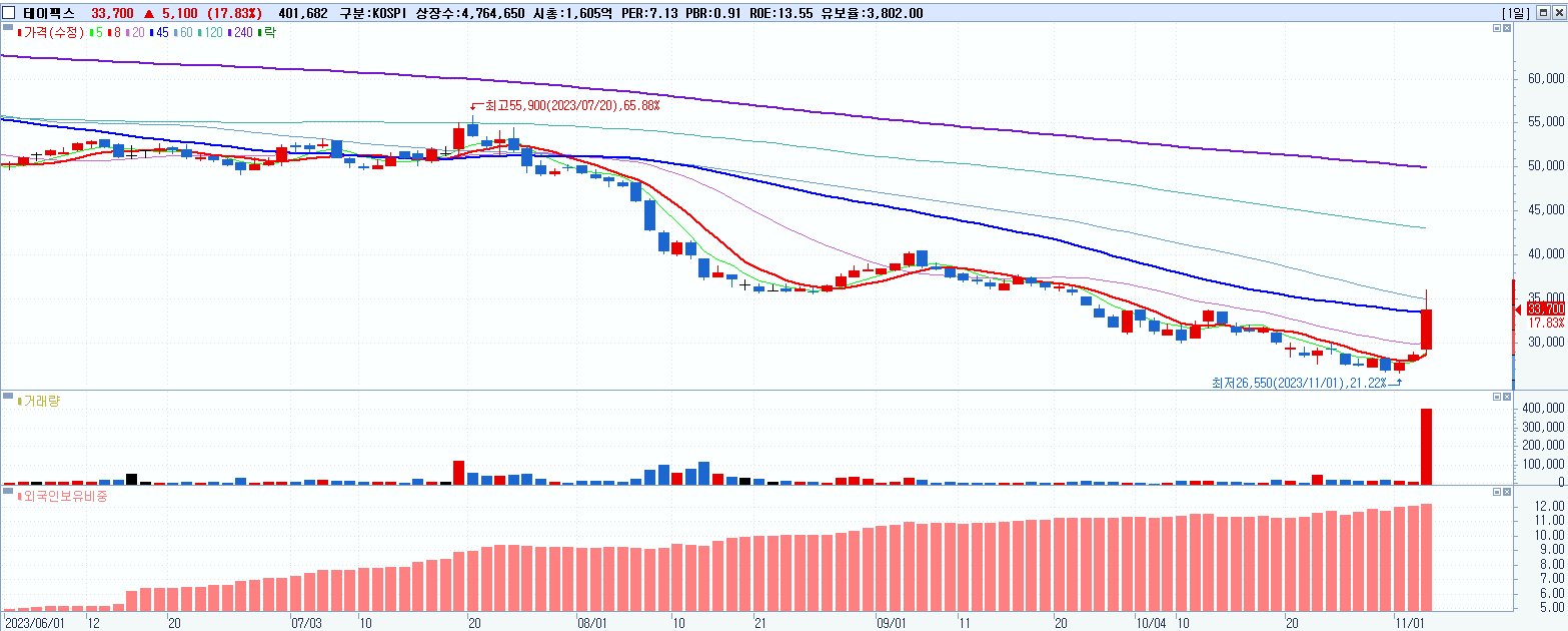 - 테이팩스 (33,700원 ▲ 17.83% , 시총: 1,606억, 거래량: 395,550, 거래대금:134억)