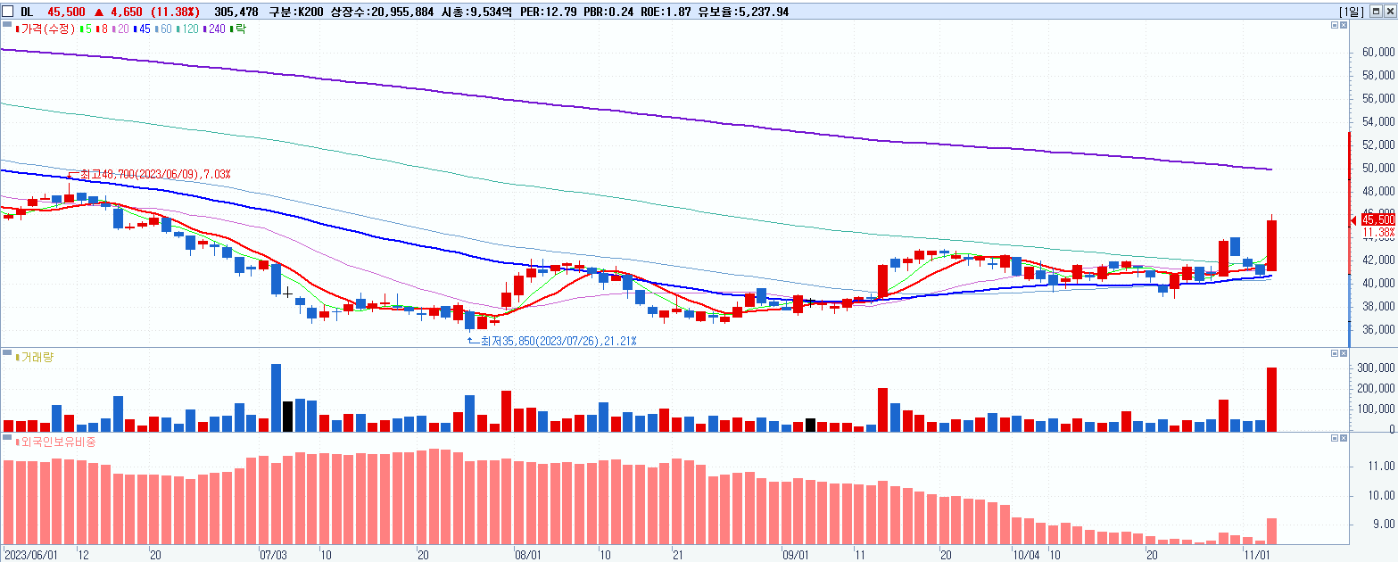 - DL (45,500원 ▲ 11.38% , 시총: 9,535억, 거래량: 302,466, 거래대금:135억)