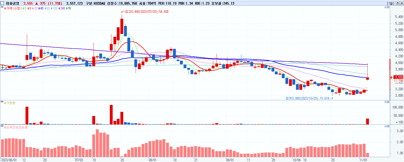 - 이화공영 (3,555원 ▲ 11.79% , 시총: 704억, 거래량: 3,557,123, 거래대금:133억)