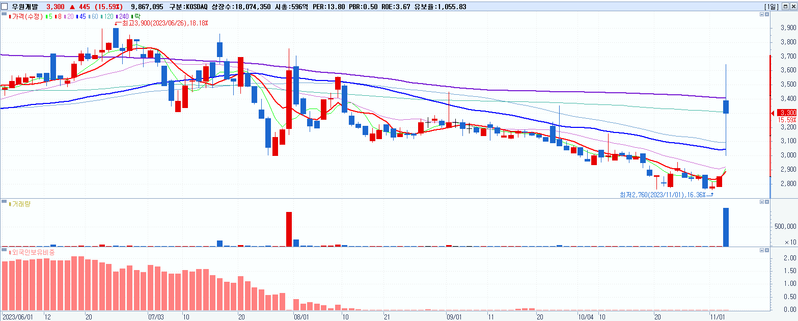 - 우원개발 (3,300원 ▲ 15.59% , 시총: 596억, 거래량: 9,867,095, 거래대금:337억)