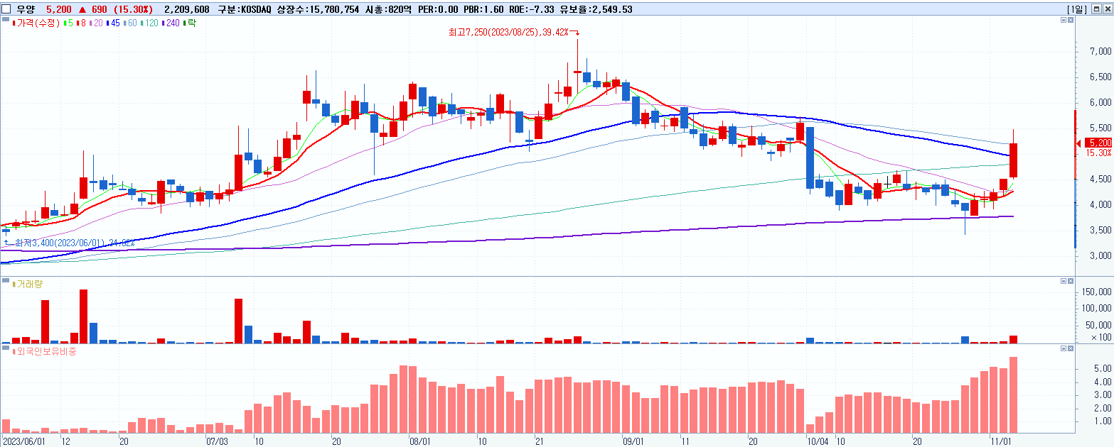 - 우양 (5,200원 ▲ 15.3% , 시총: 821억, 거래량: 2,209,608, 거래대금:113억)