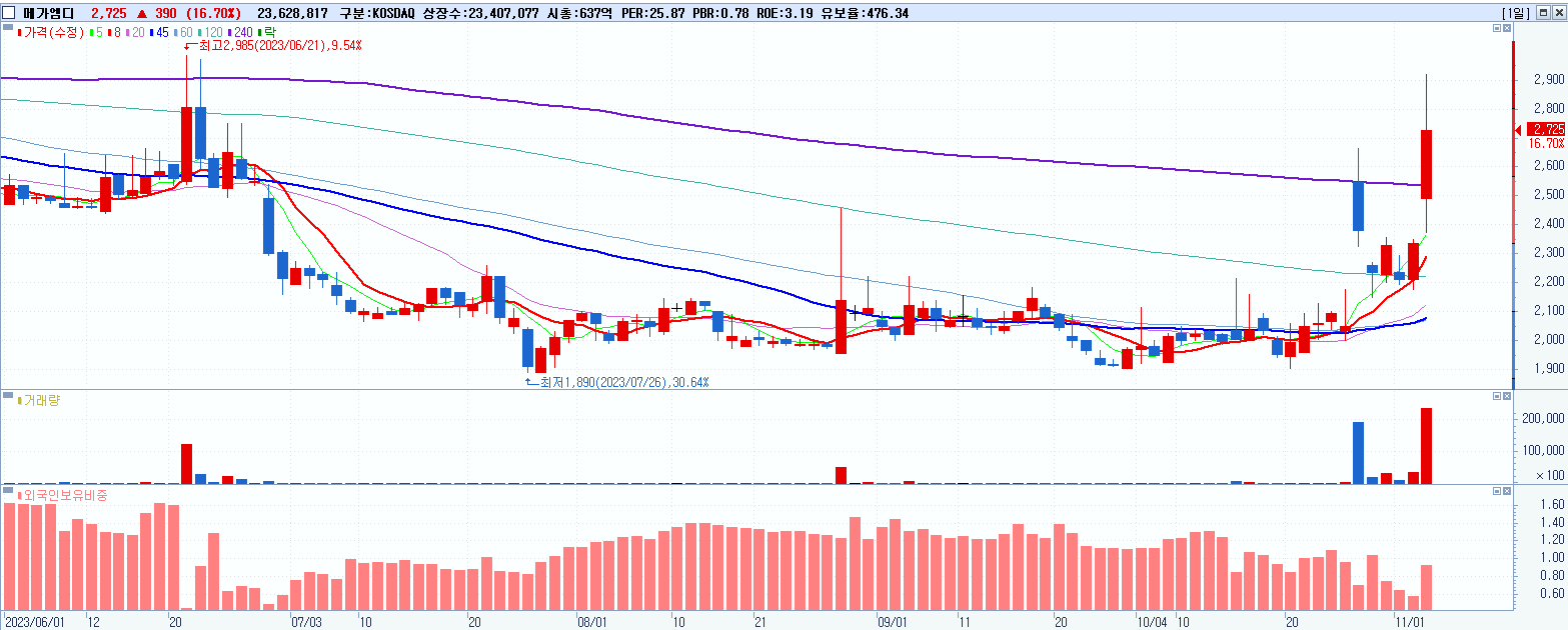 - 메가엠디 (2,725원 ▲ 16.7% , 시총: 638억, 거래량: 23,628,817, 거래대금:649억)
