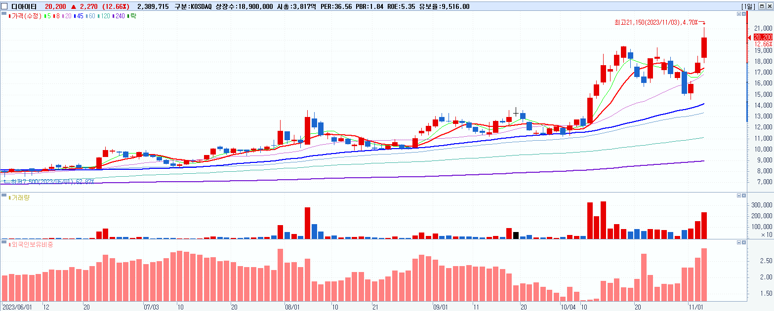 - 디아이티 (20,200원 ▲ 12.66% , 시총: 3,818억, 거래량: 2,389,715, 거래대금:473억)