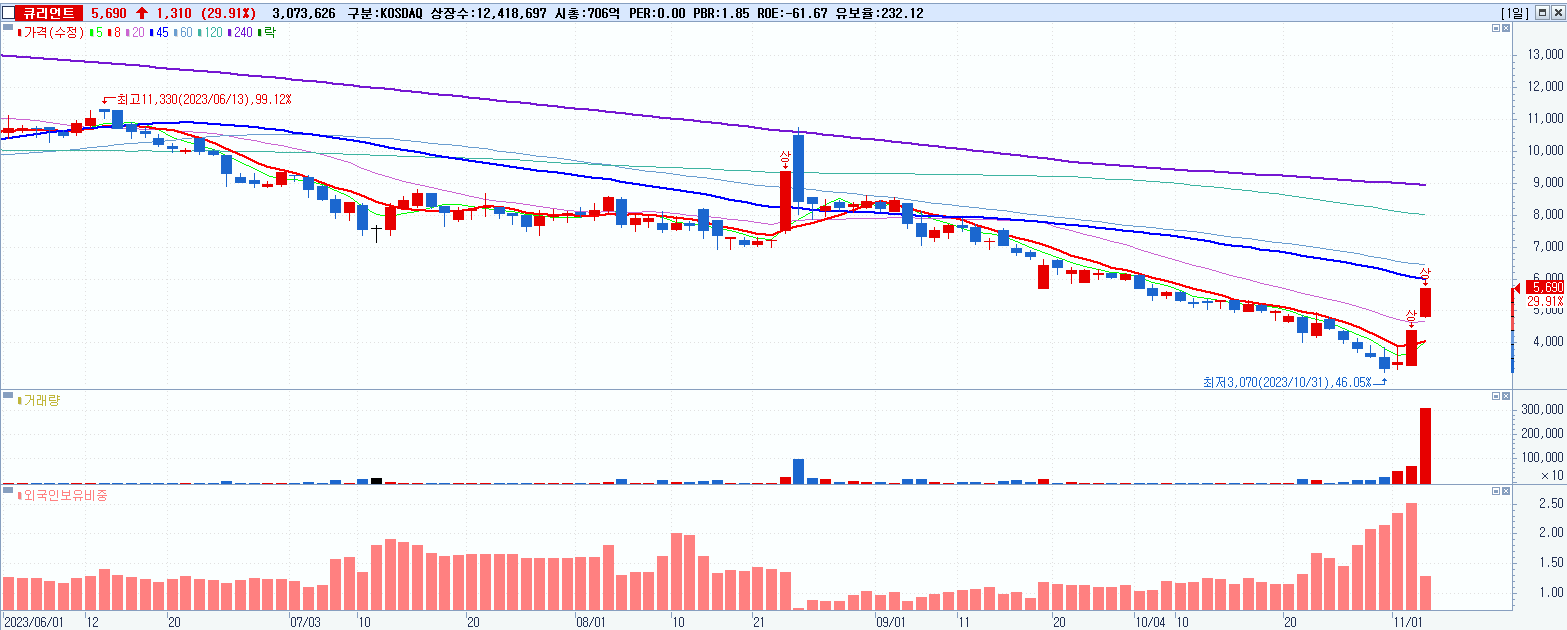 - 큐리언트 (5,690원 ▲ 29.91% , 시총: 707억, 거래량: 3,073,626, 거래대금:164억)