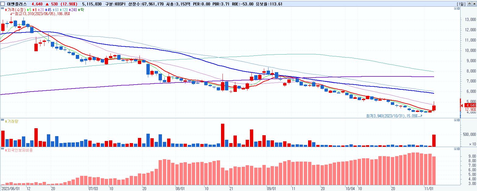 - 이엔플러스 (4,640원 ▲ 12.9% , 시총: 3,153억, 거래량: 5,064,084, 거래대금:236억)