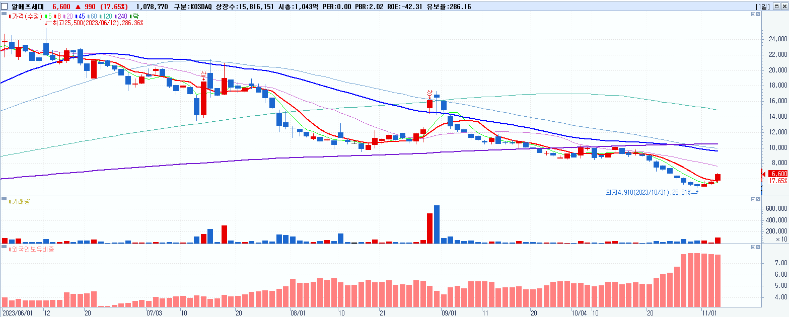 - 알에프세미 (6,600원 ▲ 17.65% , 시총: 1,044억, 거래량: 1,078,770, 거래대금:68억)