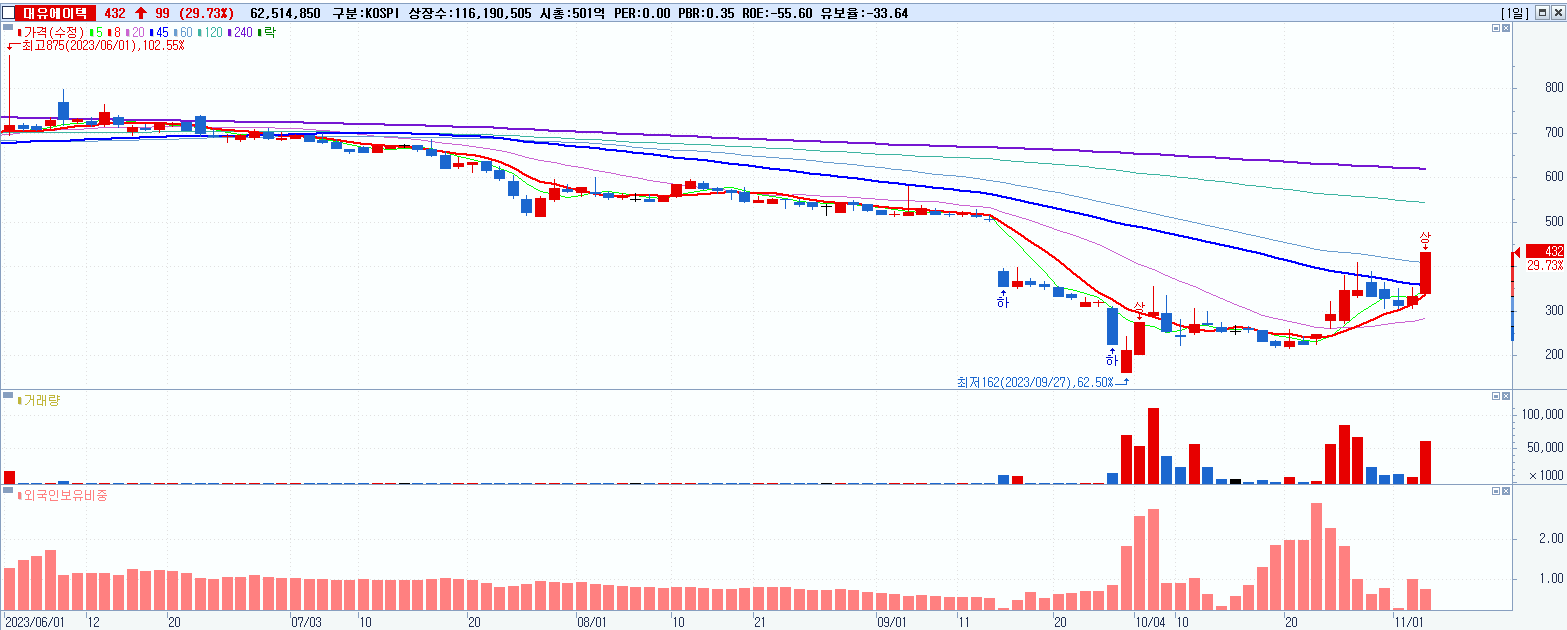 4.대유에이텍 432원 ▲ 29.73% (KOSPI, 002880)
