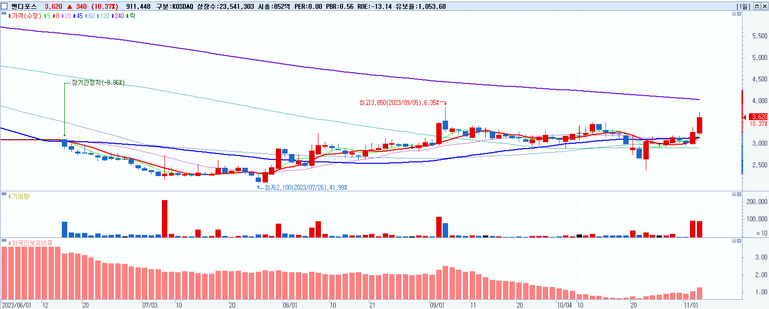 - 앤디포스 (3,620원 ▲ 10.37% , 시총: 852억, 거래량: 911,448, 거래대금:33억)