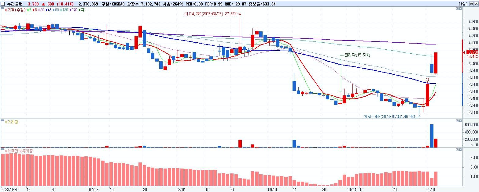 - 누리플랜 (3,730원 ▲ 18.41% , 시총: 265억, 거래량: 2,376,069, 거래대금:80억)