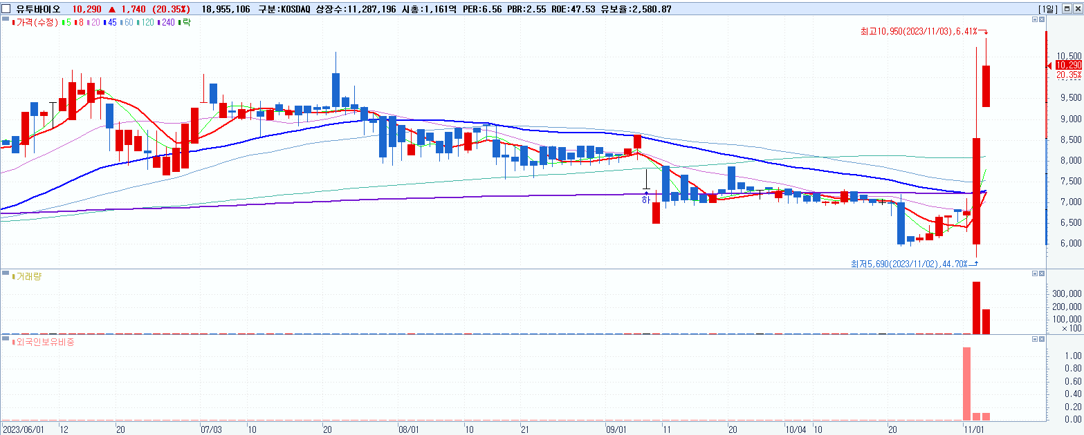 - 유투바이오 (10,290원 ▲ 20.35% , 시총: 1,161억, 거래량: 18,955,106, 거래대금:1,927억)
