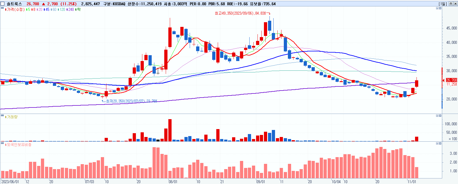 - 솔트룩스 (26,700원 ▲ 11.25% , 시총: 3,004억, 거래량: 2,825,447, 거래대금:746억)