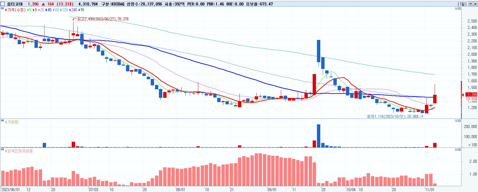 - 옵티코어 (1,396원 ▲ 13.31% , 시총: 393억, 거래량: 4,310,784, 거래대금:62억)