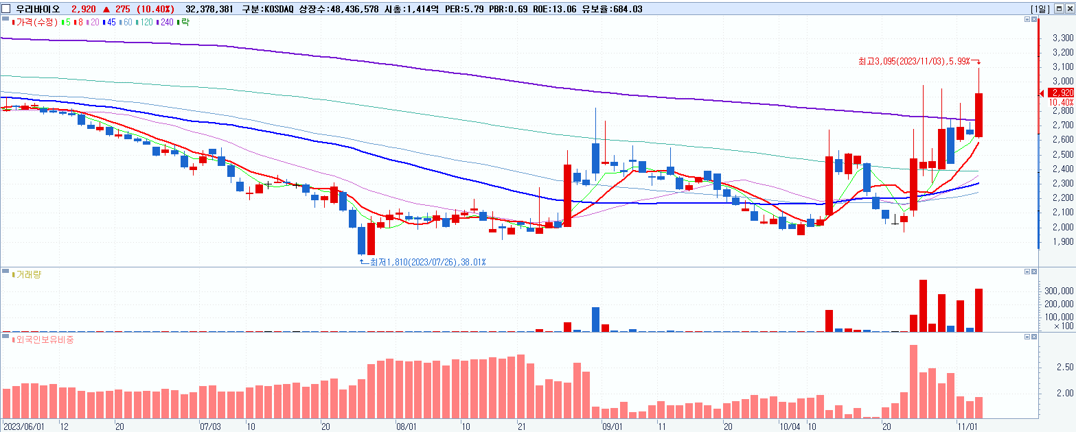 - 우리바이오 (2,920원 ▲ 10.4% , 시총: 1,414억, 거래량: 32,378,381, 거래대금:960억)