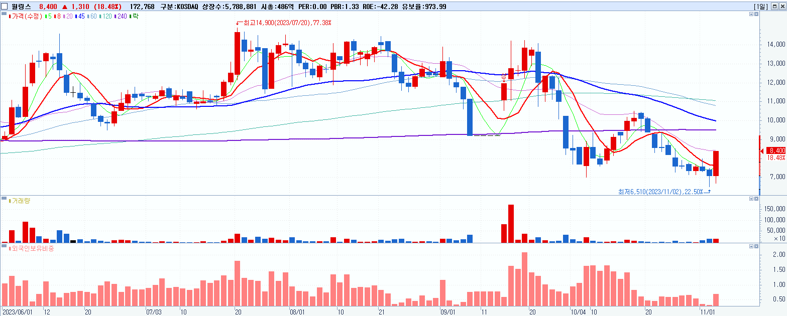 - 윌링스 (8,400원 ▲ 18.48% , 시총: 486억, 거래량: 172,768, 거래대금:13억)