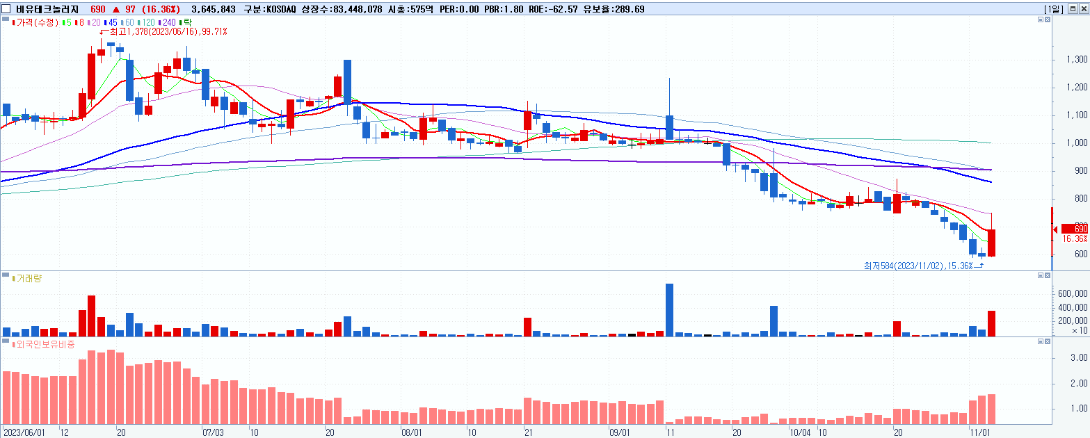 - 비유테크놀러지 (690원 ▲ 16.36% , 시총: 576억, 거래량: 3,645,843, 거래대금:25억)