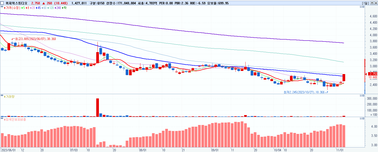 - 위지윅스튜디오 (2,750원 ▲ 10.44% , 시총: 4,704억, 거래량: 1,427,811, 거래대금:38억)