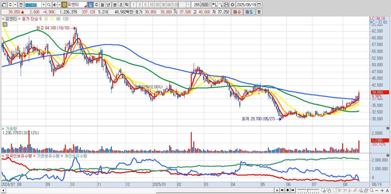 - 피엔티 (39,800원 ▲ 6.85% , 시총: 9,450억, 거래량: 701,205, 거래대금:276억)
