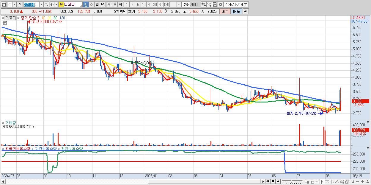 - 더코디 (3,160원 ▲ 11.86% , 시총: 163억, 거래량: 303,559, 거래대금:10억)