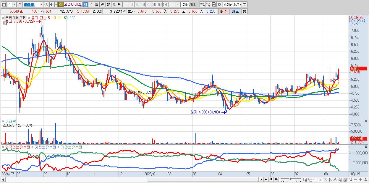 - 코리아에프티 (5,640원 ▲ 7.63% , 시총: 1,570억, 거래량: 723,570, 거래대금:40억)