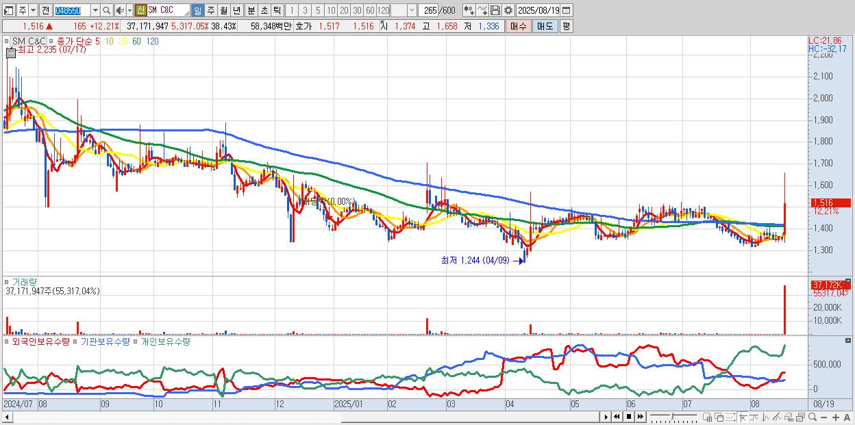 - SM C&C (1,516원 ▲ 12.21% , 시총: 1,466억, 거래량: 37,171,947, 거래대금:583억)