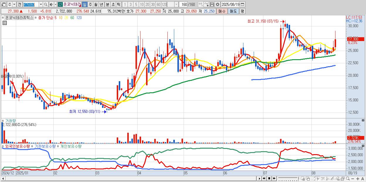 - 온코닉테라퓨틱스 (27,800원 ▲ 7.75% , 시총: 3,076억, 거래량: 1,460,783, 거래대금:404억)