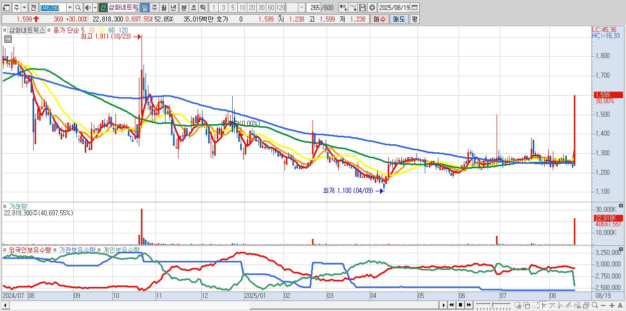 - 삼화네트웍스 (1,599원 ▲ 30% , 시총: 690억, 거래량: 22,818,300, 거래대금:350억)