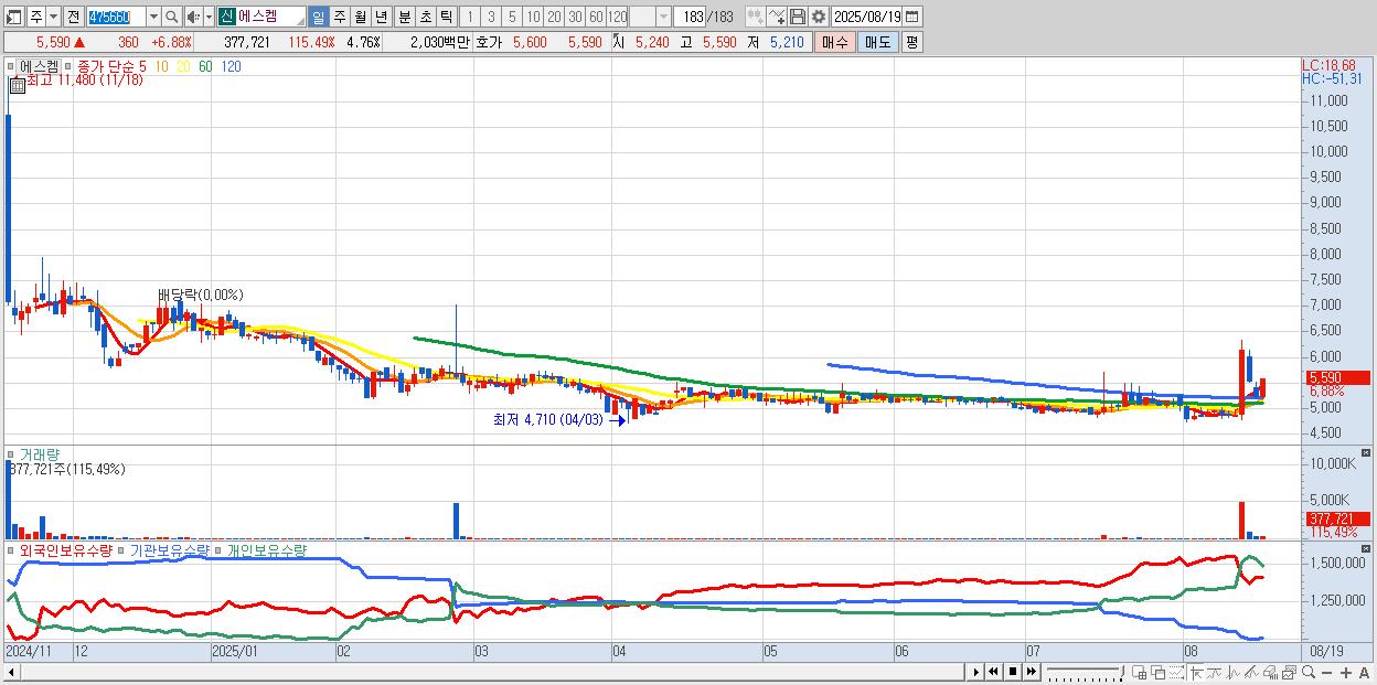 - 에스켐 (5,590원 ▲ 6.88% , 시총: 443억, 거래량: 377,721, 거래대금:20억)