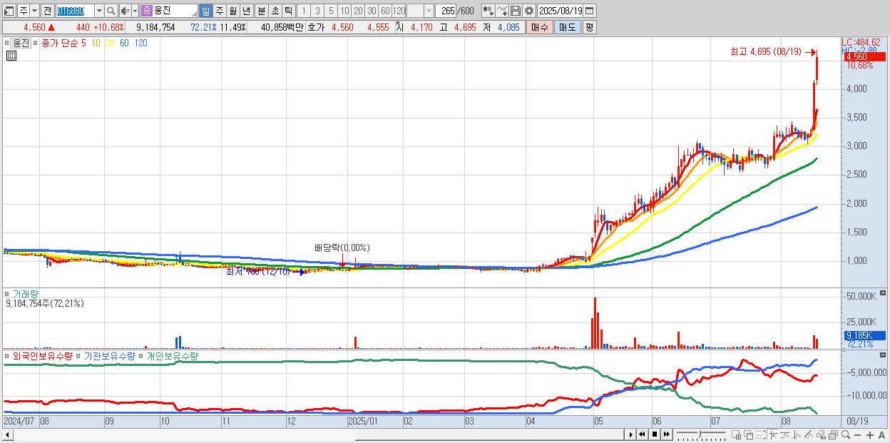 - 웅진 (4,560원 ▲ 10.68% , 시총: 3,645억, 거래량: 9,184,754, 거래대금:409억)