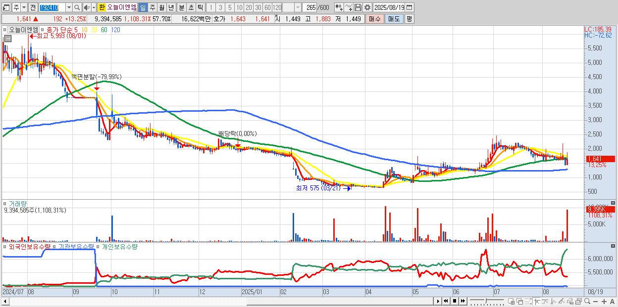 - 오늘이엔엠 (1,641원 ▲ 13.25% , 시총: 267억, 거래량: 9,394,585, 거래대금:166억)