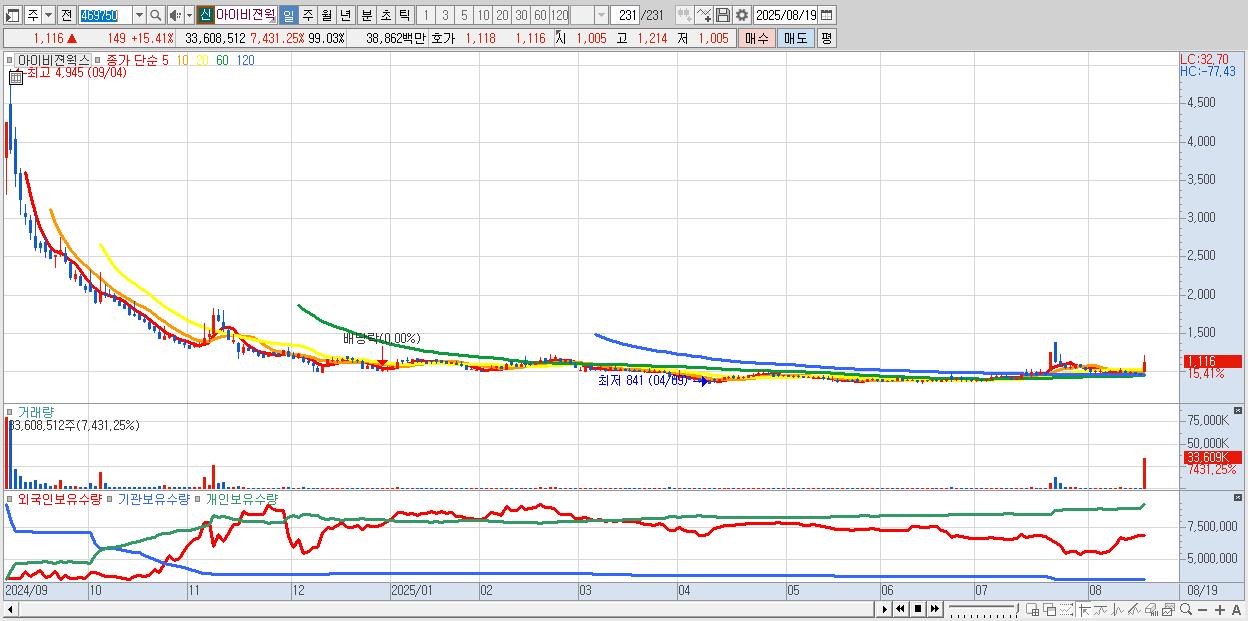 - 아이비젼웍스 (1,116원 ▲ 15.41% , 시총: 379억, 거래량: 33,608,512, 거래대금:389억)
