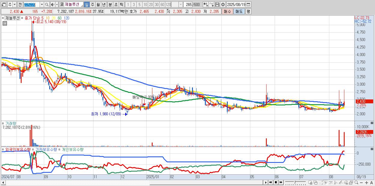 - 제놀루션 (2,430원 ▲ 7.28% , 시총: 466억, 거래량: 7,282,187, 거래대금:191억)