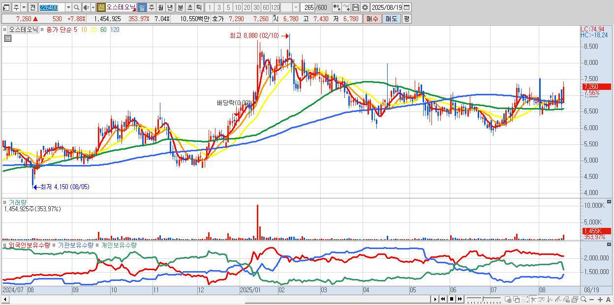 - 오스테오닉 (7,270원 ▲ 8.02% , 시총: 1,502억, 거래량: 958,991, 거래대금:70억)