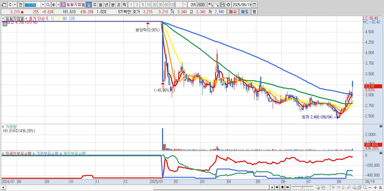 - 일월지엠엘 (3,210원 ▲ 8.63% , 시총: 570억, 거래량: 181,610, 거래대금:6억)