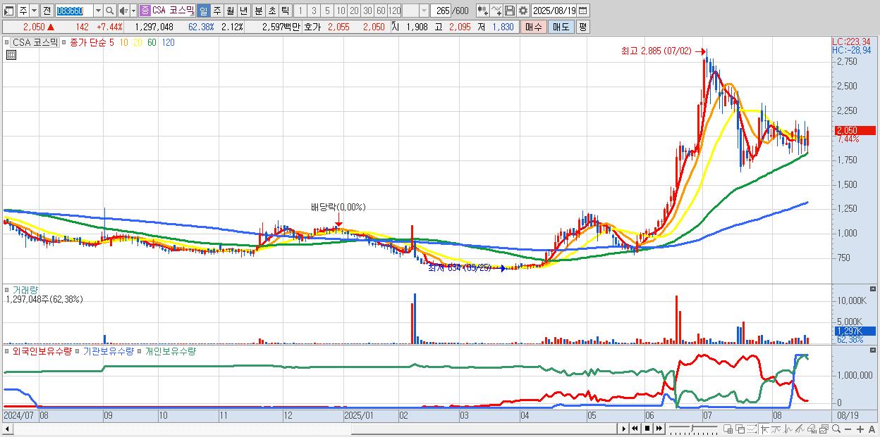 - CSA 코스믹 (2,050원 ▲ 7.44% , 시총: 1,256억, 거래량: 1,297,048, 거래대금:26억)