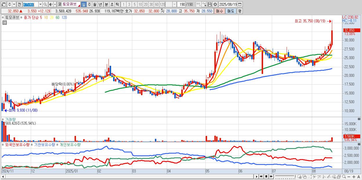 - 토모큐브 (33,550원 ▲ 14.51% , 시총: 4,447억, 거래량: 2,120,820, 거래대금:708억)