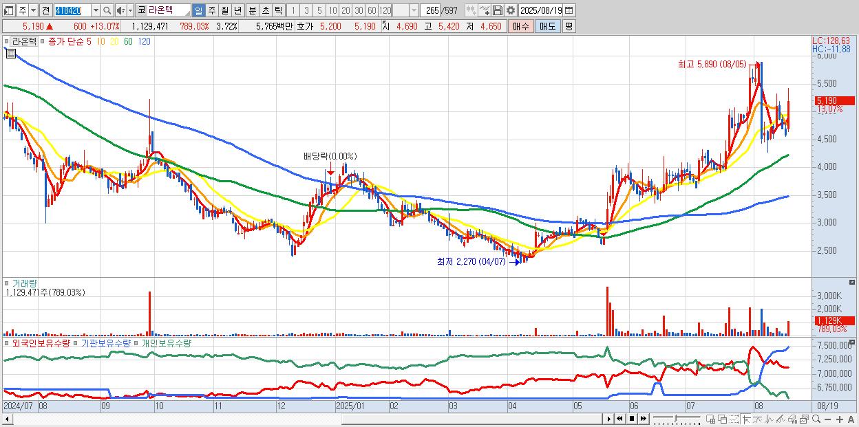 - 라온텍 (5,190원 ▲ 13.07% , 시총: 1,575억, 거래량: 1,129,471, 거래대금:58억)