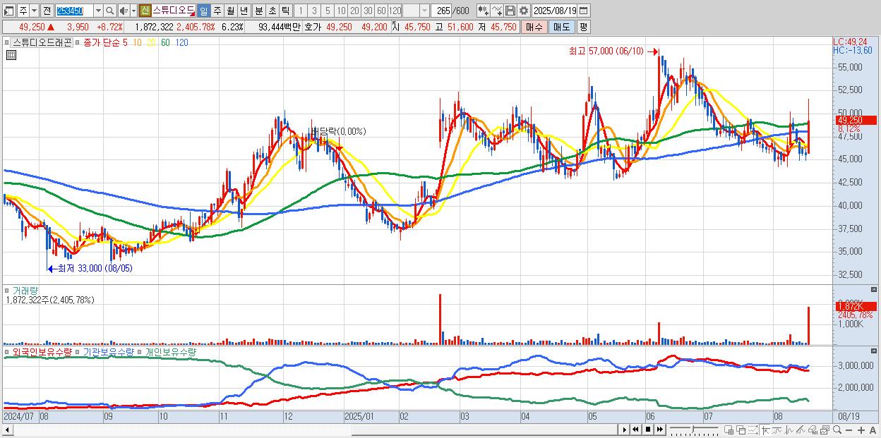 - 스튜디오드래곤 (49,350원 ▲ 8.94% , 시총: 14,834억, 거래량: 1,130,143, 거래대금:565억)