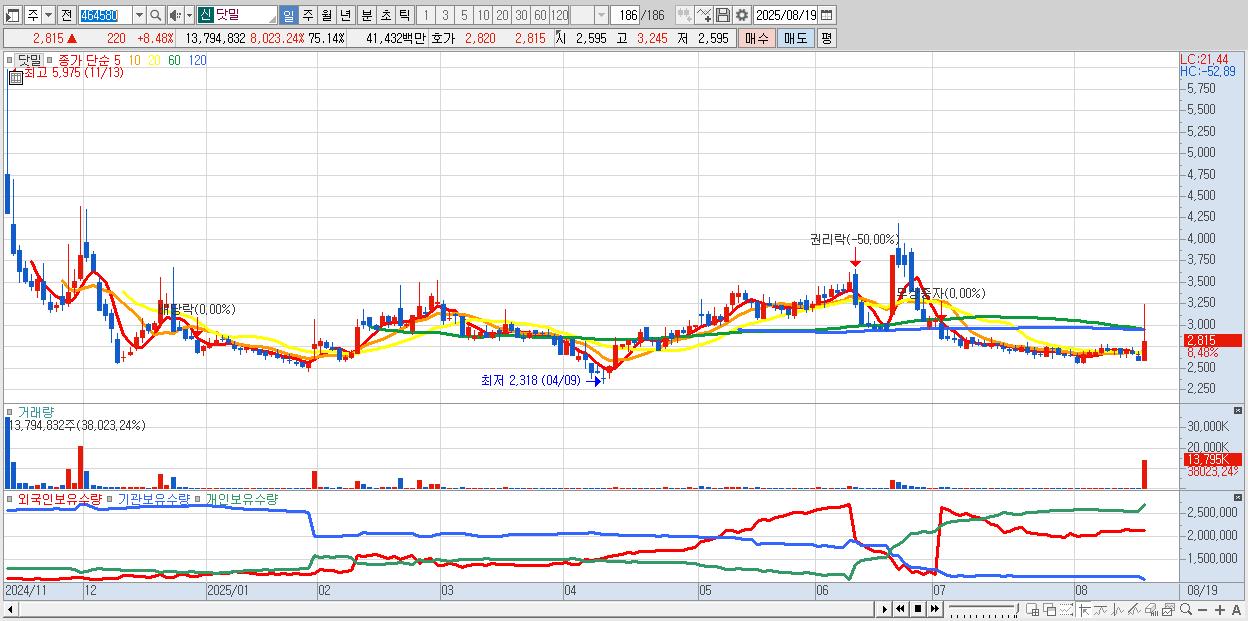- 닷밀 (2,815원 ▲ 8.48% , 시총: 517억, 거래량: 13,794,832, 거래대금:414억)