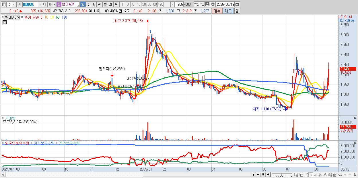 - 현대ADM (2,140원 ▲ 16.62% , 시총: 1,035억, 거래량: 37,766,219, 거래대금:804억)
