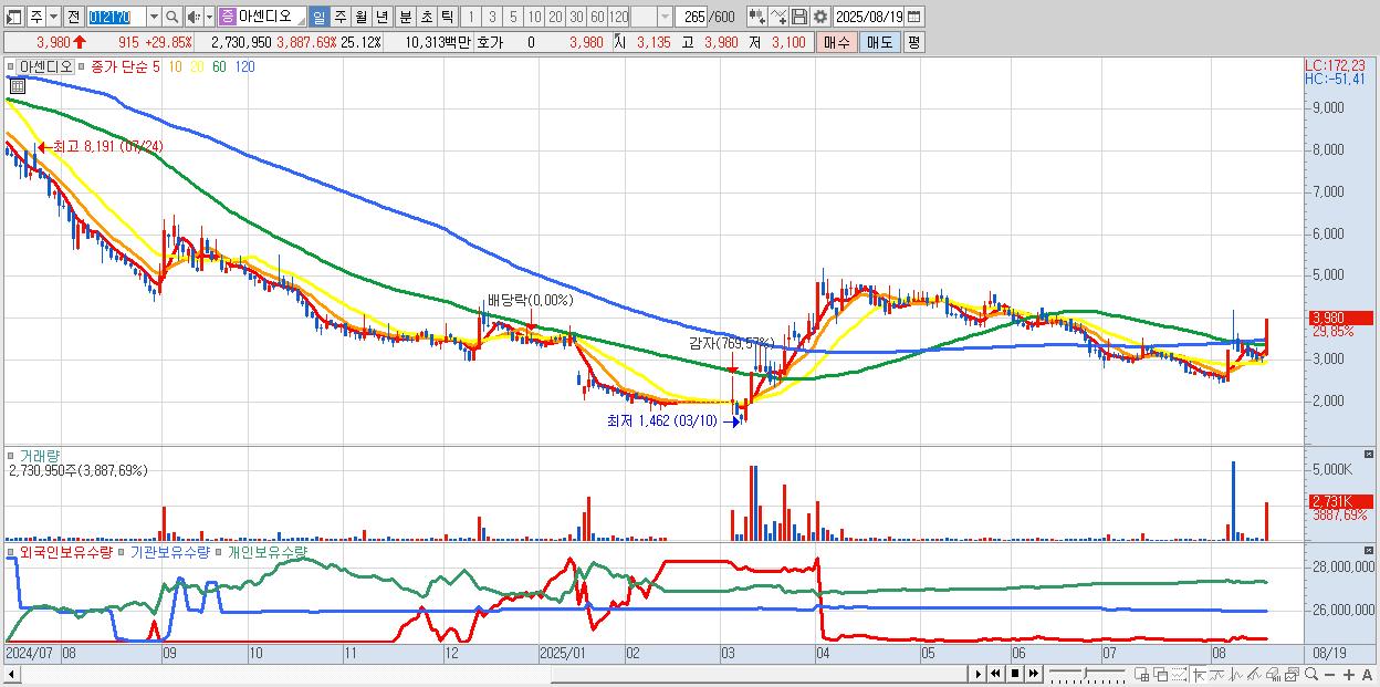 - 아센디오 (3,980원 ▲ 29.85% , 시총: 433억, 거래량: 2,730,950, 거래대금:103억)